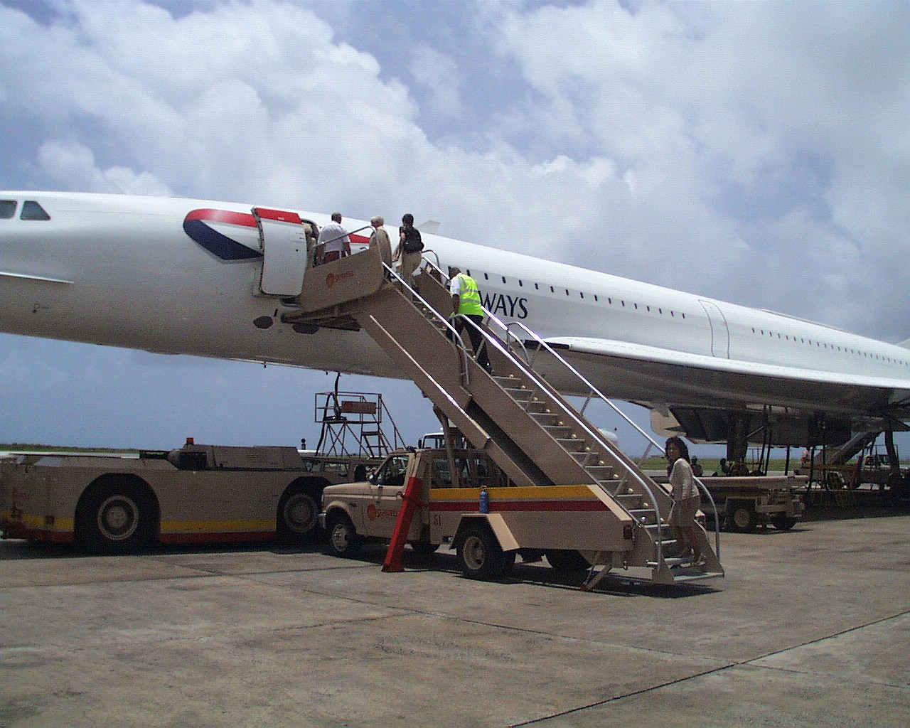 Angela boarding Concorde in Barbados for our trip to the UK – August 2003
